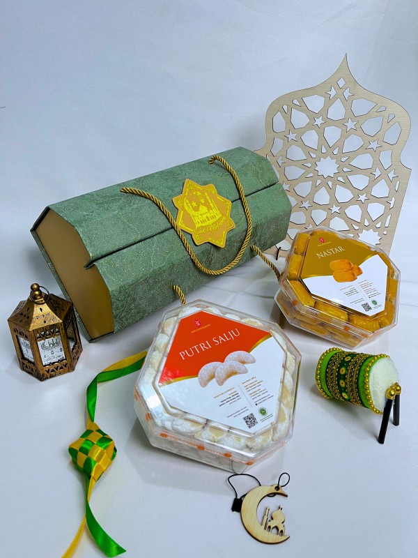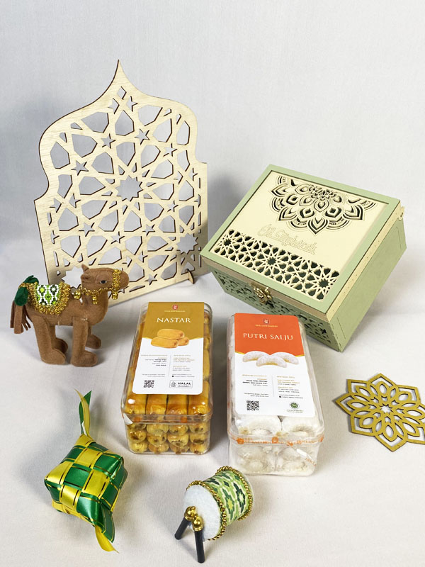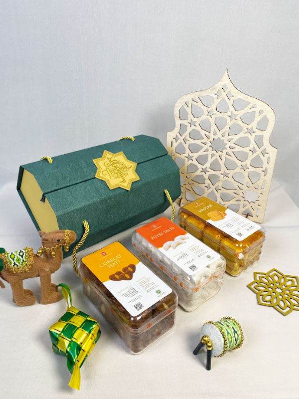 Hampers aneka cookies seperti nastar, kastangel serta putri salju yang dipadukan dengan beragam produk.